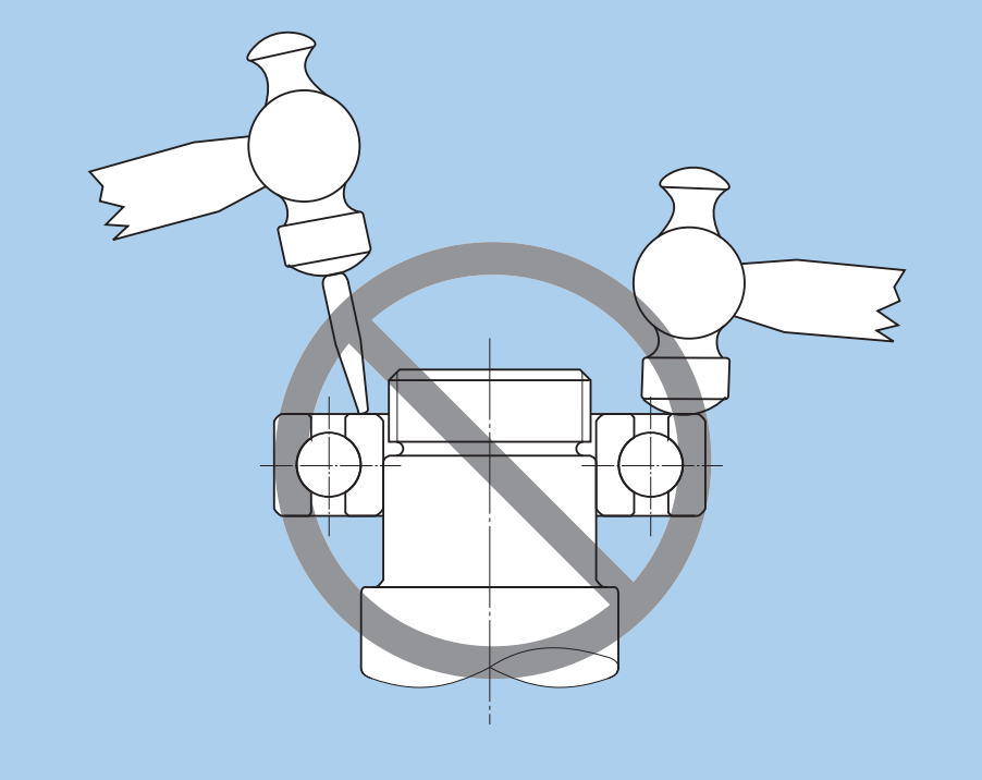 如上圖所示,如果使用榔頭或錘子,把軸承硬敲進去,顯然是不行的,很明顯會損傷軸承的結(jié)構(gòu),甚至直接在安裝時就把軸承報廢掉了,正確的做法是通過壓力,將軸承緩慢壓入。