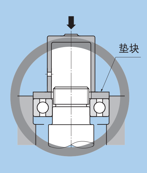 如上圖所示,簡單的對兩邊施加壓力,將軸承壓入,也是不行的,一是壓力要施加在內(nèi)圈,二是受力容易不均勻,將造成軸承滾道面出現(xiàn)壓痕或傷痕。