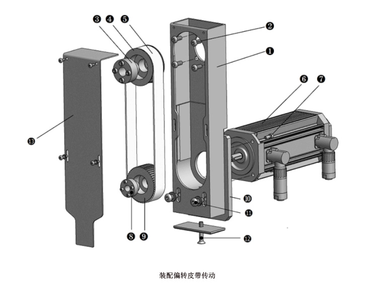 1.用緊固螺釘2將偏轉(zhuǎn)皮帶傳動(dòng)1的殼體安裝在線性軸上的所需位置。