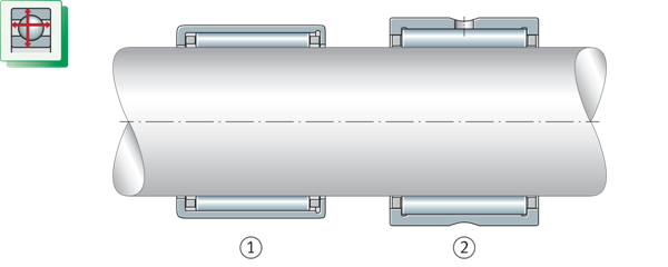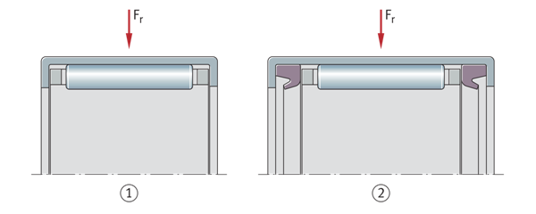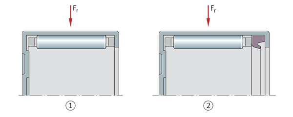 徑向設(shè)計包絡(luò)比較: ①帶開口端和保持架的沖壓外圈滾針軸承 ②帶保持架的滾針軸承 | ![]() |