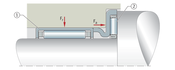 開口端沖壓外圈滾針軸承與軸向滾針軸承組合 Fr=徑向載荷 Fa=軸向載荷 ①開口端沖壓外圈滾針軸承HK(用于支撐徑向載荷) ②軸向滾針軸承AXW(用于支撐軸向載荷) | ![]() |