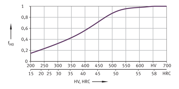 如果滾道滿足滾動軸承材料的要求,但低于670 HV,則軸承布置上的負(fù)載較低。為了確定軸承裝置的動態(tài)和靜態(tài)承載能力,軸承的基本動態(tài)額定載荷C必須乘以折減系數(shù)fH(動態(tài)硬度系數(shù)),基本靜態(tài)額定載荷C0r乘以折減因子fH0(靜態(tài)硬度系數(shù))