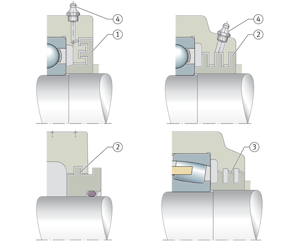 迷宮式密封示例 ①帶軸向對齊橫擋的迷宮 ②帶徑向對齊橫擋的迷宮 ③帶斜面橫檔的迷宮 ④錐形潤滑嘴,符合DIN 71512-A標準,帶集成保護迷宮 | ![]() |
