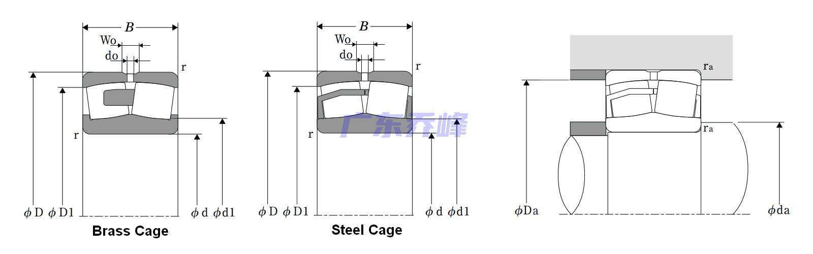 一體式機加工黃銅保持架,抗沖擊性好,剛度大(B型:每排一個機加工黃銅保持架)
