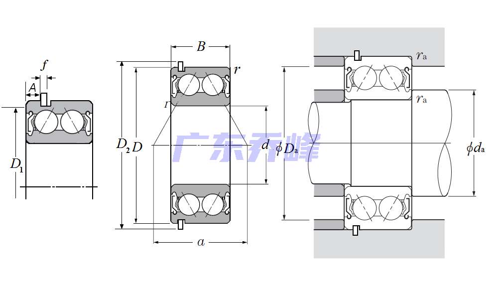 | 雙列角接觸球軸承 - 雙面防塵蓋帶止動環 - 尺寸 | |