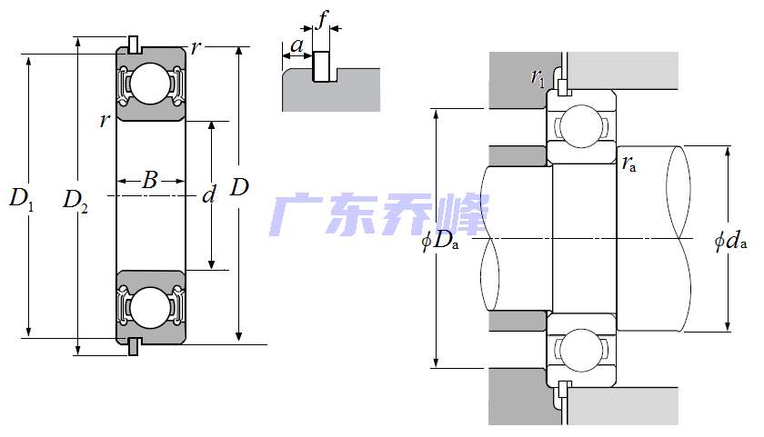 | 單列深溝球軸承 - 雙面密封(輕接觸橡膠密封)帶止動環 - 尺寸 | |