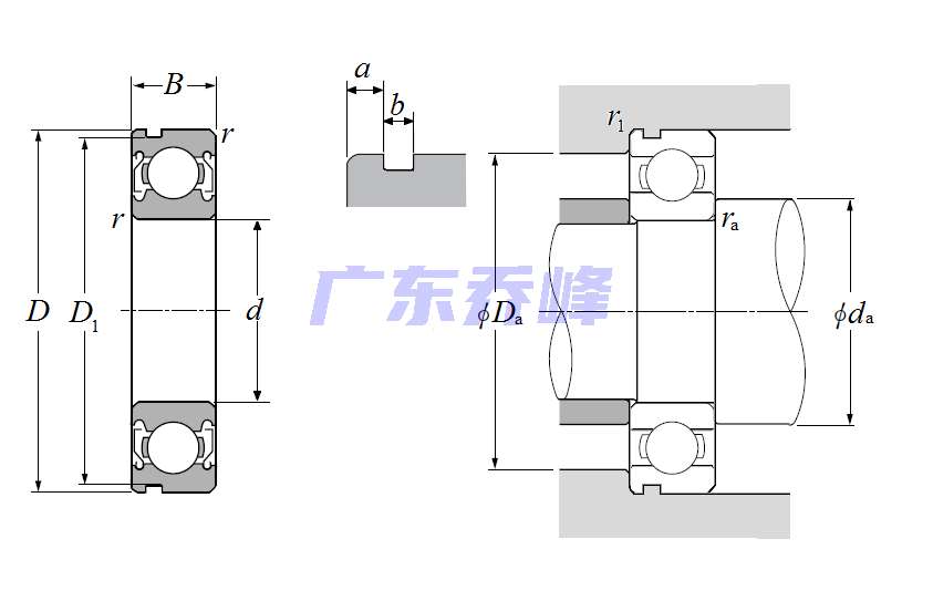 | 單列深溝球軸承 - 雙面防塵蓋,帶止動環(huán)槽 - 尺寸 | |