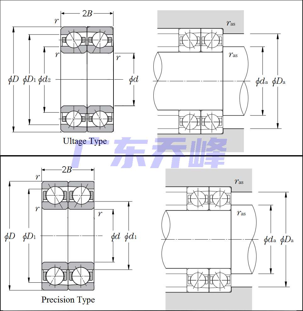 | 雙聯角接觸球軸承 - 面對面配對 - 尺寸 | |
