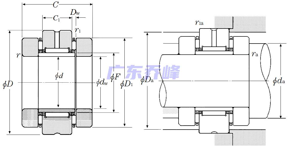 | 帶雙向推力滾針軸承的滾針組合軸承 - AXN型 - 尺寸 | |