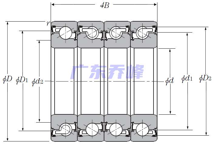 | 滾珠絲杠用四列角接觸推力球軸承 - DTBT配對(duì),雙面密封,兩排承受軸向載荷 - 尺寸 | |