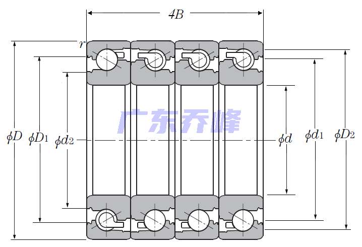 | 滾珠絲杠用四列角接觸推力球軸承 - DFTT配對,開式,三排承受軸向載荷 - 尺寸 | |
