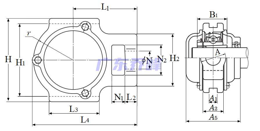 | 滑塊式軸承座,鑄造外殼,帶緊定襯套,鑄造防塵蓋,封閉端蓋,UKT型 - 尺寸 | |