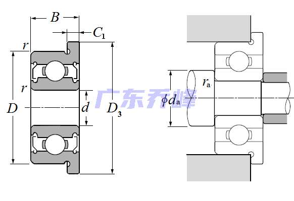 | 單列深溝球軸承帶法蘭外圈 - 雙面防塵蓋 - 尺寸 | |
