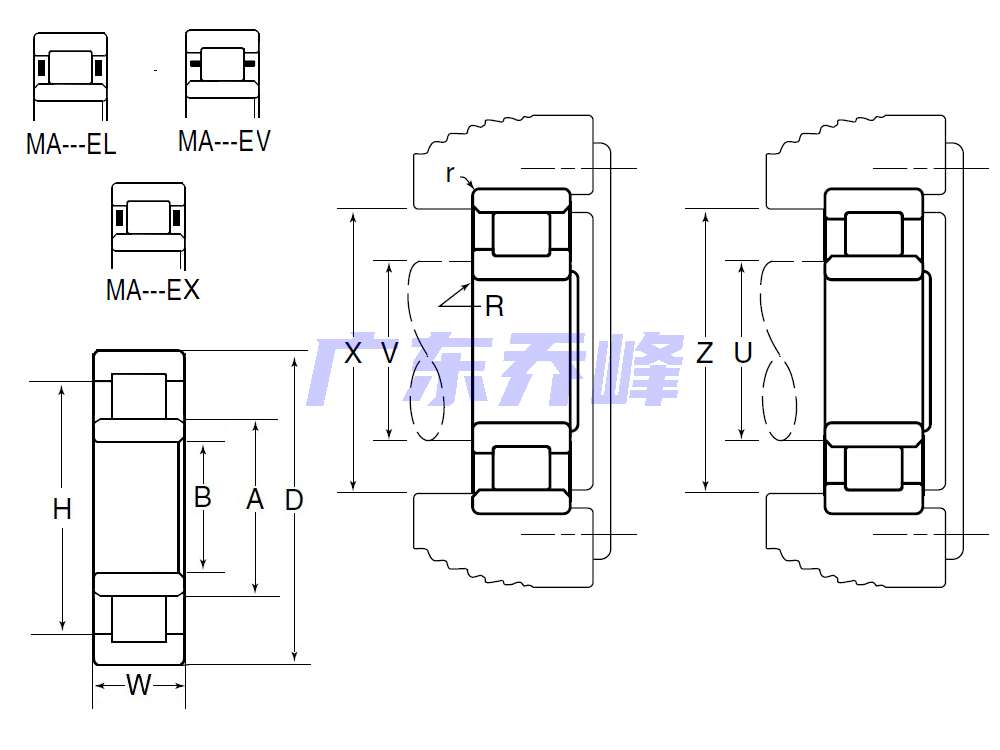 軸承型號:MA5218EV,圓柱滾子軸承 -可分離型,普通內圈,外圈帶兩個加強筋,其基礎型號為5218,前綴列表:【MA:M:NTN BOWER產品,標準公制尺寸系列,A:滑動內圈】,后綴列表:【E:外圈雙擋邊】【V:一體成型鋼保持架】