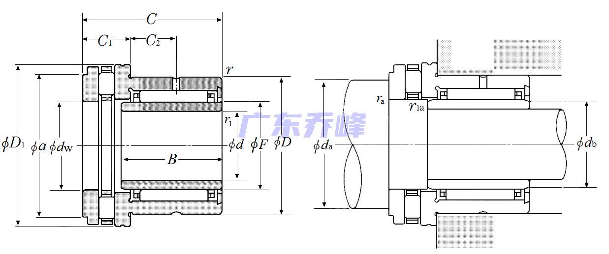 | 滾針和推力圓柱滾子組合軸承 - 開式帶內(nèi)圈 - 尺寸 | |
