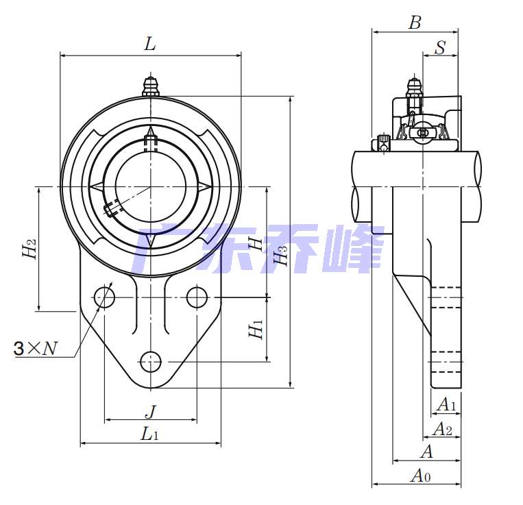 | 三螺栓法蘭式軸承座單元,鑄造外殼,帶緊定螺釘,UCFH型 - 尺寸 | |