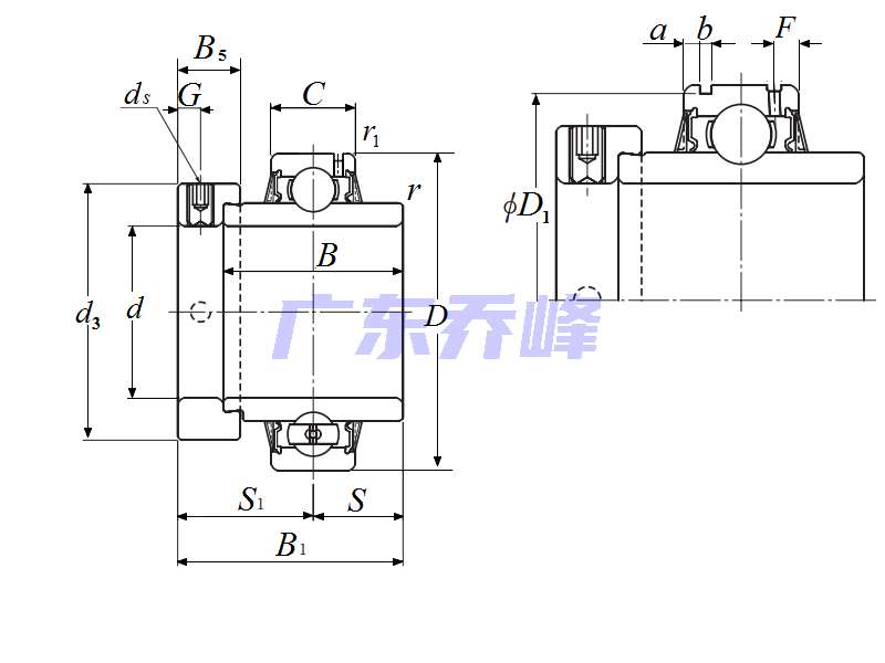 軸承型號:UELS212-207LD1N,帶偏心鎖緊套的外球面軸承,寬外圈 - 圓柱內徑,帶止動環槽,其基礎型號為212-207,前綴列表:【UEL:寬內圈,鎖圈帶拋油環】【S:圓柱外圈】,后綴列表:【L:設計變更,更薄的內圈,內徑變大】【D1:帶油槽油孔,可再潤滑】【N:帶止動槽】